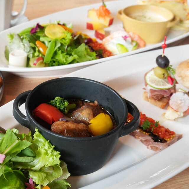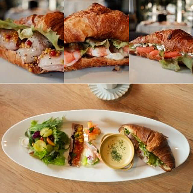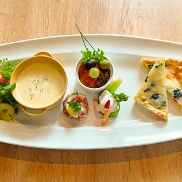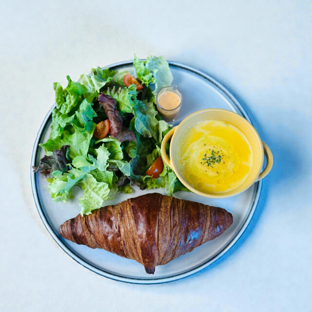 選べる焼き立てパンとサラダとスープとドリンクがついたランチセットです